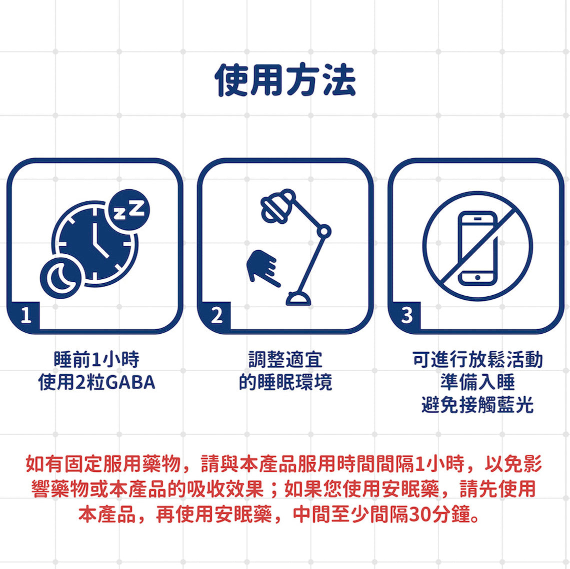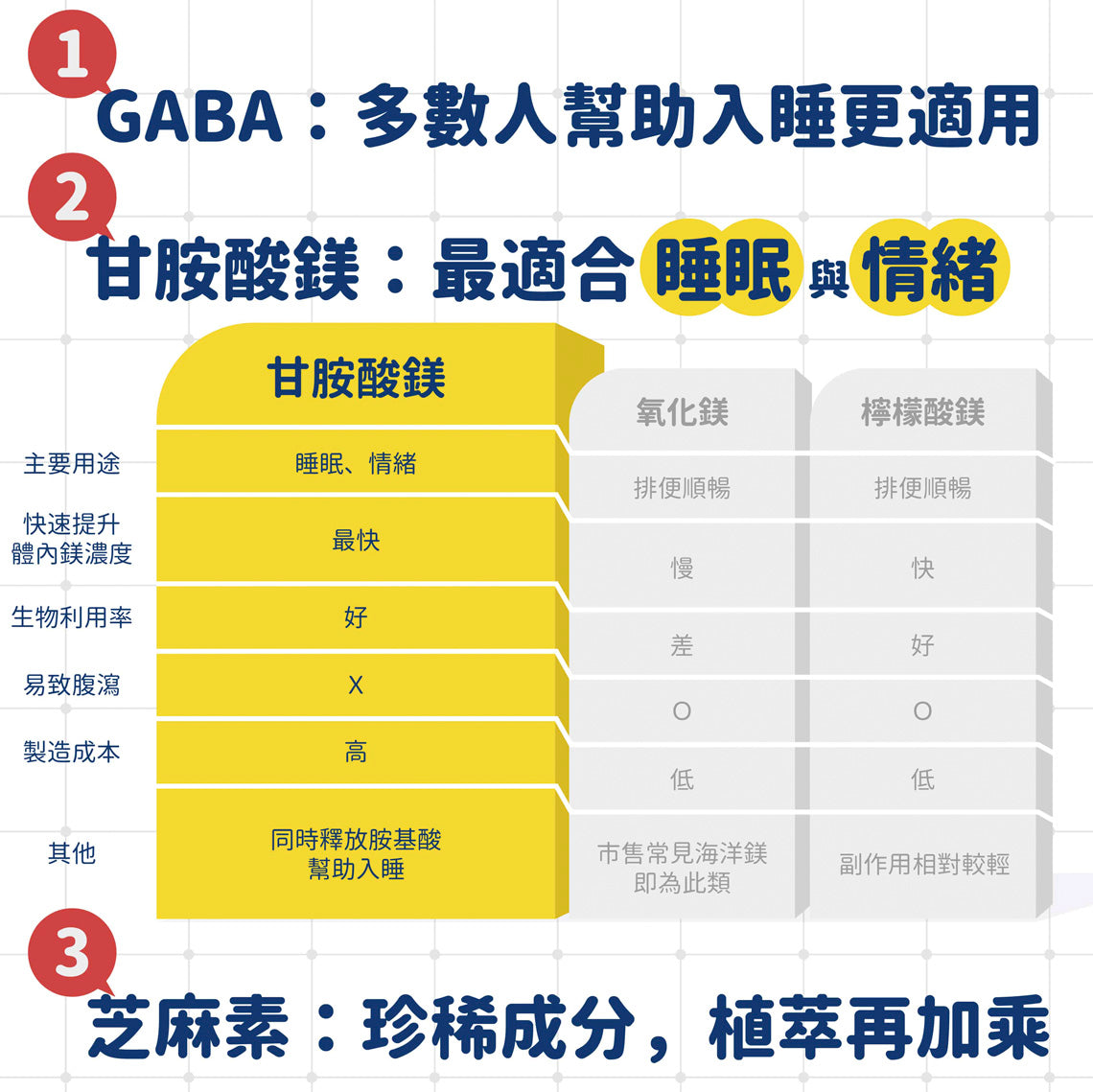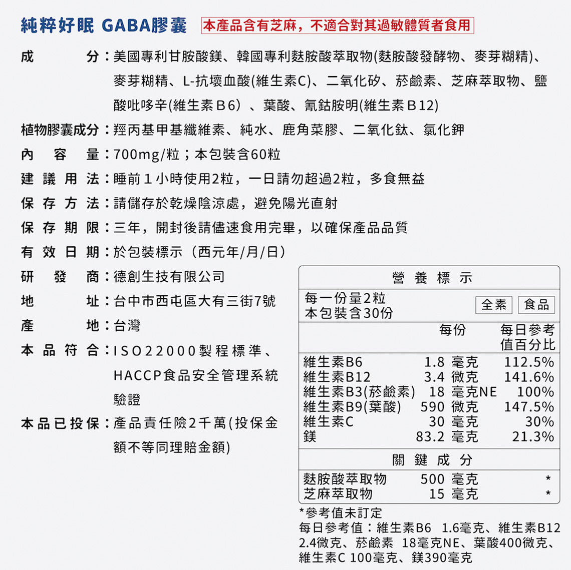 商品特色包含足量專利成分GABA,搭配嚴選好吸收的甘胺酸鎂,並添加植萃芝麻素幫助入睡,此外,更有維生素B3、B6、B12及葉酸作為好眠助攻手,維他命C則提供抗氧化支持。《德創生技×身心科醫師聯手研發》,精心打造一首入夜晚安曲,幫助入睡,讓白天更能精力旺盛。
